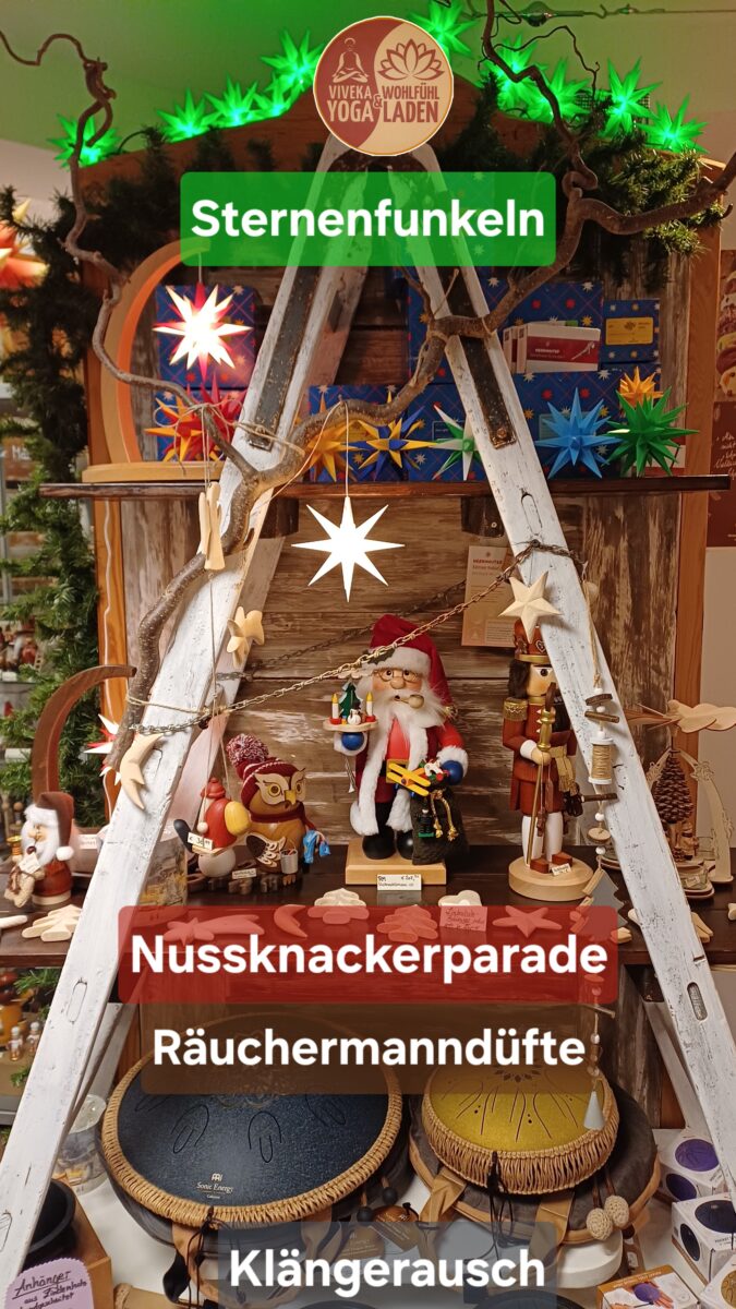 …Erzgebirgskunst; Herrnhuter Sterne + Zubehör; Duftkerzen; verschiedenste Accessoires; bunte Naturseifen, Bäder & -Kosmetik; leckere Bioschokis (auch von Goldhelm) sowie besondere Lebensmittel (griech. Öle/Balsamicos, Kaffee, Tee, Aufstriche usw.)!